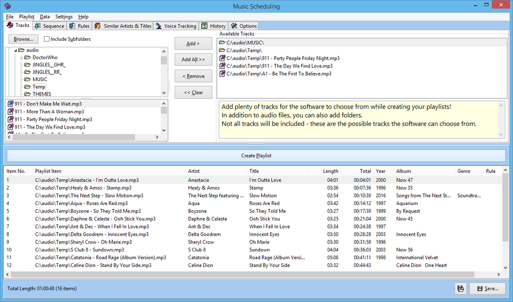 Music Scheduling can create hours of playlists within minutes - which you can then use in your audio player or playout software. Ideal for home studios, community radio, hospital radio and student radio.